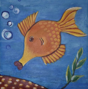 2025Deze vis heb ik in linosnede, monotype en hier in acryl gemaakt.